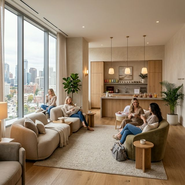 산모들간의 소통과 휴식을 위한 호텔 수준의 라운지로, 유기농 티와 간식을 즐길 수 있습니다.